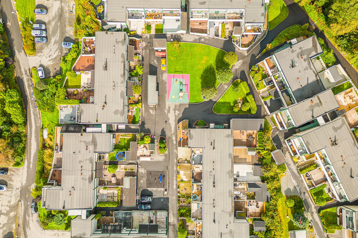 Et dronebilde kan gi kjøperen et inntrykk av hvordan området rundt boligen ser ut, og vise hvor nært man er til viktige fasiliteter som skoler, butikker, parker og transportmuligheter.